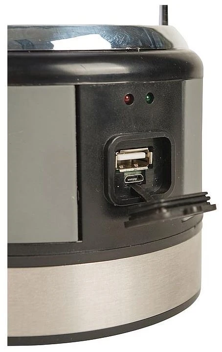 Een robuuste tafellantaarn met zonnepaneel. Door high power LED’s met een warme lichtkleur, de traploze dimmer en de witte matte kap worden een aangename verlichting gerealiseerd. In het hengsel zit een kompasje en een inklapbaar ophanghaakje. De ingebouwde Li-ion accu kan met de meegeleverde USB kabel of met de 230 volt adapter opgeladen worden. De adapter en de USB kabel kunnen onderin de lamp worden opgeborgen. De accu kan tevens worden gebruikt om bijvoorbeeld een mobiele telefoon op te laden via de USB uitgang. Brandduur: 100-9 uur. Lichtopbrengst: 8-220 lumen.